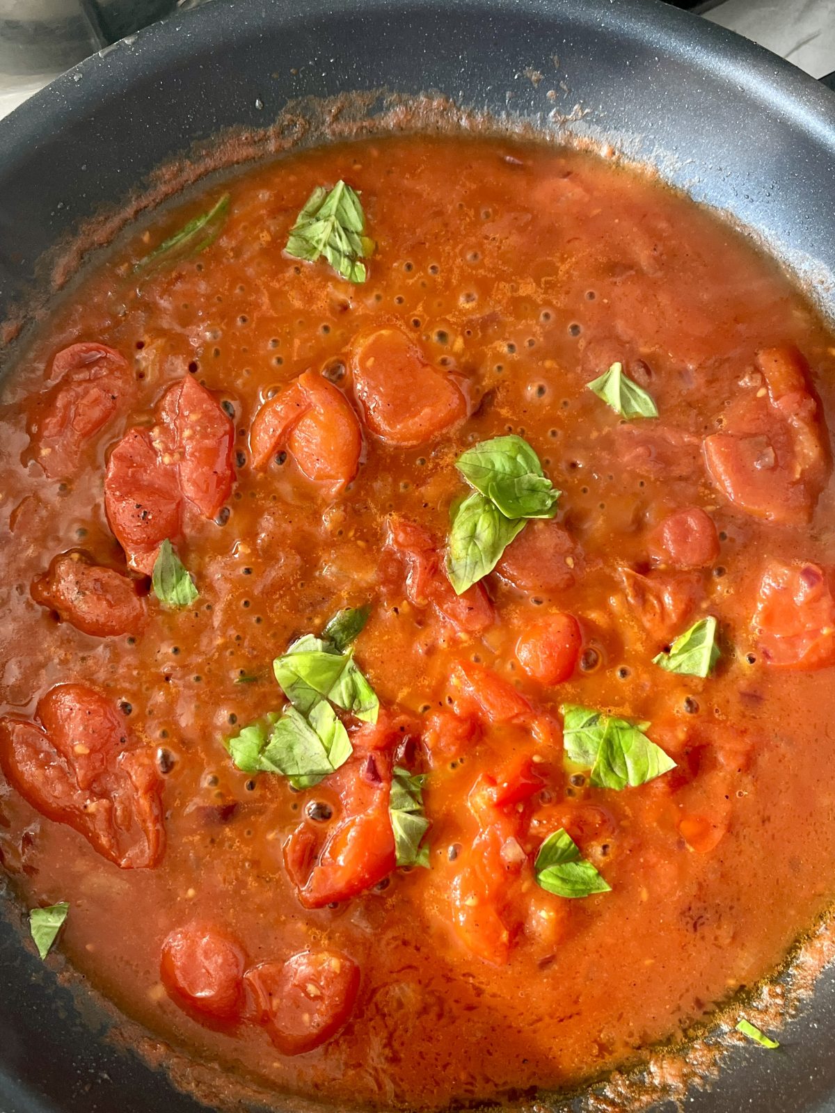 - Po chvíľke ich vyber (cesnak ti nesmie zhorieť, dostaneš horkú chuť) a hoď na panvicu čerstvé a sušené paradajky. Chvíľku orestuj a zalej pomodorom (alebo sekanými paradajkami). Pridaj soľ, čierne korenie a prihoď pár lístkov čerstvej bazalky. Pridaj aj štipku cukru na zneutralizovanie kyslosti z paradajok. Priveď k varu a nechaj jemne vrieť aspoň 10 minút.