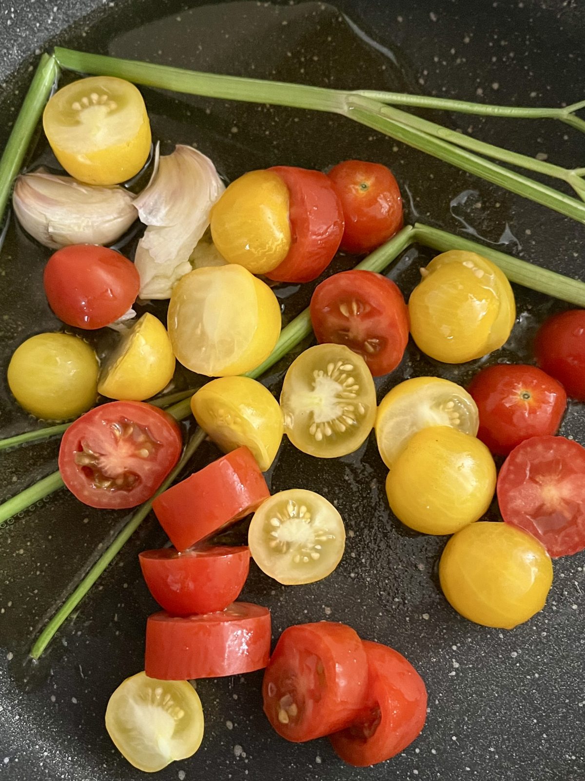 - Na panvicu na studený olivový olej si hoď stonku z petržlenovej vňate a cesnak. Olej pri zohrievaní z nich pekne vytiahne vôňu a chuť. Keď sa olej zohreje, prihoď paradajky, olivy a papriku (voliteľné).
