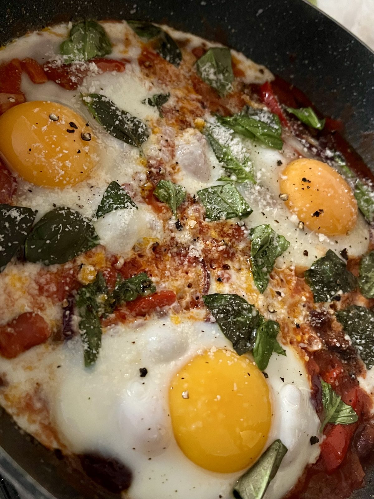 Výhodou je, že recept sa dá upraviť podľa chuti. Dá sa spraviť aj pikantná verzia – stačí na začiatku pridať do oleja čerstvé peperoncino alebo štipku sušeného chilli, ktoré olej krásne prevonia a jedlu dodá ostrosť. Rovnako môžeš pridať akúkoľvek zeleninu, ktorá ti zostala v chladničke – cuketu, špenát, olivy, mladú cibuľku či auru z papriky. Vajíčka tak zostanú základom a všetko ostatné môžeš kombinovať podľa toho, čo máš po ruke.